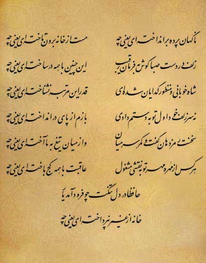 فلسفه زندگی نزد حضرت حافظ، لحظههای رهایی و رضایت است. به نظر من حافظ کسی یا چیزی را مخاطب قرار نمیدهد بلکه به نظر میرسد او خود، مخاطب صدای طبیعت و مخاطب آوای عزیمت بهسوی حقیقت است. حقیقت در نزد حافظ، قابل جستجو نیست او حقیقت را نمیجوید و راه طولانی بهسوی حقیقت را نمیپوید (که یک کرشمه ساقی تلافی صد جفا بکند...) بلکه آن را میبوید. باری، وظیفه ما بوییدن آرزو است نه پیوستن به آرزو... [...]